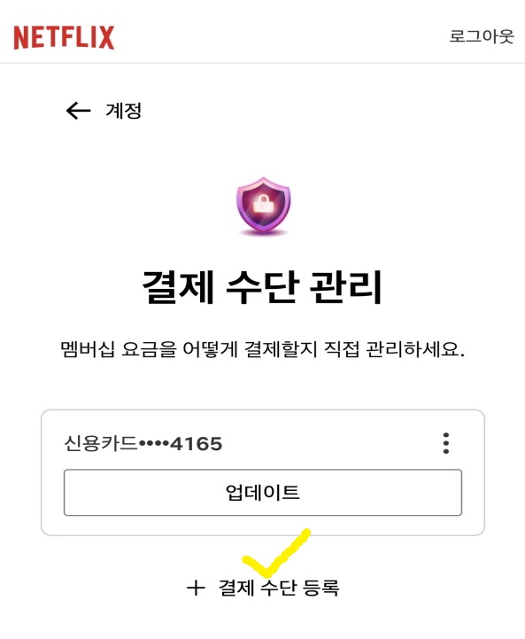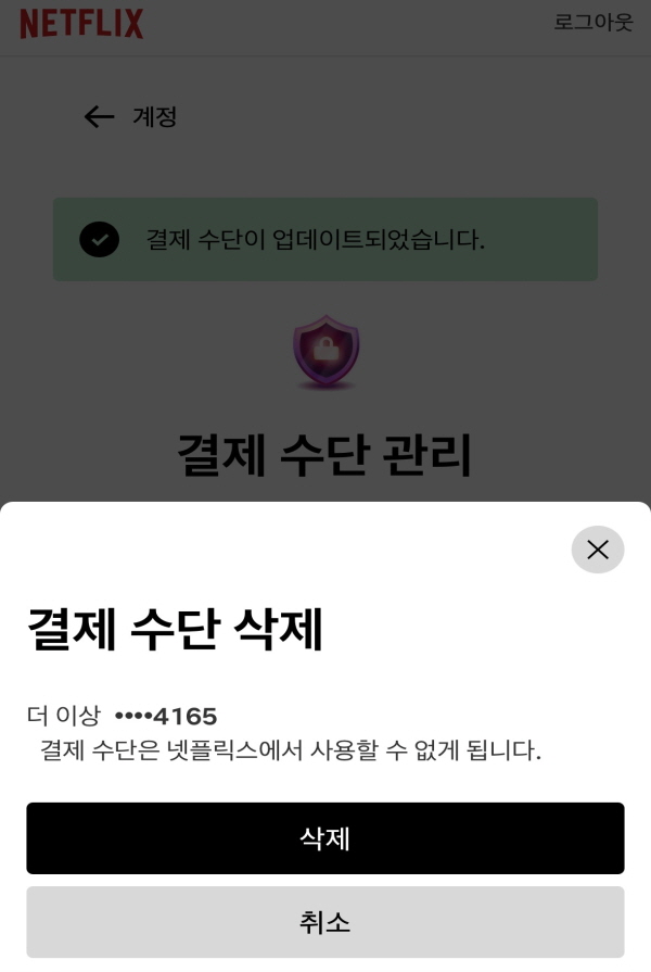 이렇게 기존에 등록돼 있는 카드를 삭제해 주시면 넷플릭스의 결제수단 변경이 완료됩니다.