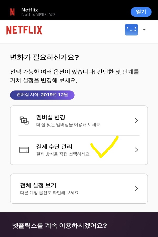 넷플릭스 이용하다 보면 등록된 결제 카드를 변경해야 하는 일이 생기 실 텐데요. 저도 신용카드 사용을 줄여보고자 기존에 등록된 신용카드 대신 체크카드로 변경을 하기 위해서 결제수단을 변경해 보았는데 앱 자체에서는 바로 변경이 안돼서 조금 헤매다 보니 시간이 좀 걸렸어요.