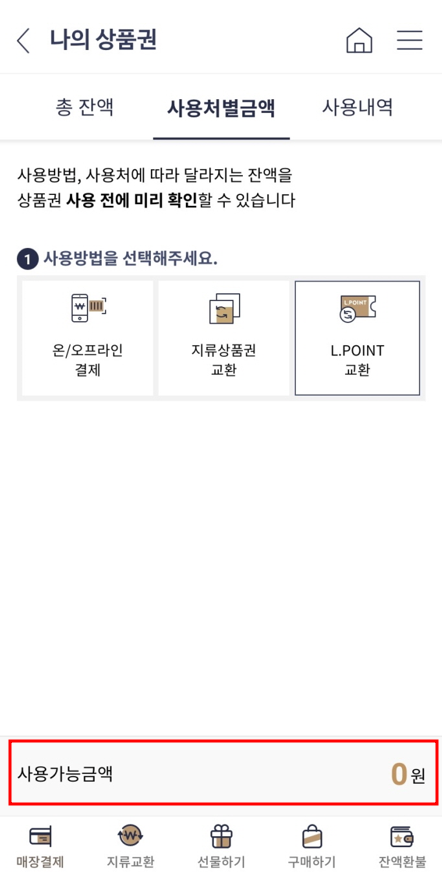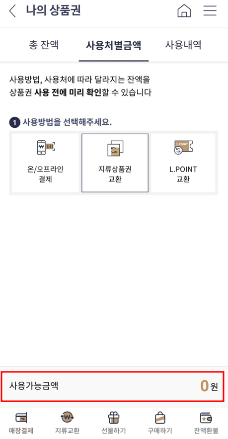사용처에 따라 위에 사용방법을 선택해서 사용할 수 있어요. 지류상품권과 L.POINT로 교환해서 사용할 수 있으니 용도에 맞게 선택해서 사용하시면 됩니다.