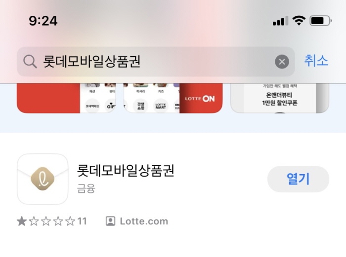 우선 앱스토어에 들어가 롯데모바일상품권앱을 다운받았어요. 사진은 앱설치 후 캡처한 화면이라 열기버튼이 보여지네요. 롯데앱에 마지막으로 로그인한게 언제인지 까마득해 아이디, 패스워드도 기억이 않나서 아이디를 찾고 패스워드를 재설정하는 지난한(?) 과정을 거쳐 드디어 앱에 로그인!