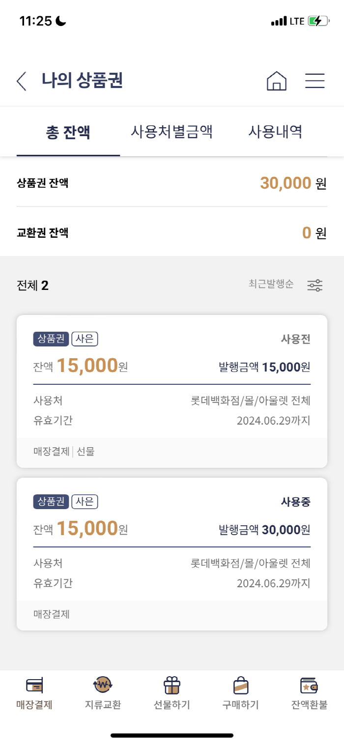 저는 며칠 후에 백화점에 갈 일이 있어서 현장에서 결제하기로 하고 교환은 하지 않았어요. 롯데백화점에 쇼핑을 갔다가 점심먹으러 백화점 푸드코트에 가서 30,000원을 야무지게 잘 썼답니다. 오프라인 결제는 위에 보이는 것처럼 [매장에서 결제하기]를 터치하면 바코드가 보여지는데 이 바코드를 결제하실 때 보여주시면 됩니다.