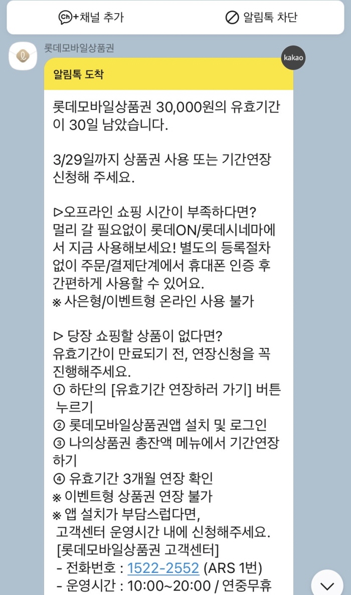 카카오톡으로 받은 롯데모바일상품권 기간연장 알림톡!