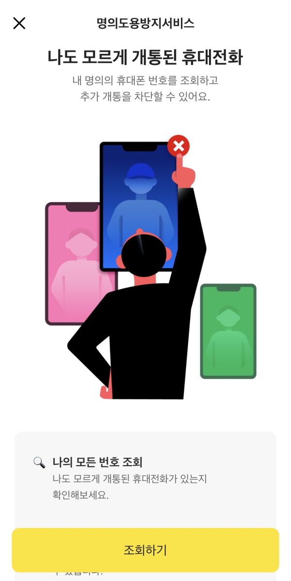 따라서, 명의도용방지 서비스를 통해 내 명의로의 불법적인 휴대전화 개통을 사전에 차단하는 것이 매우 중요합니다.