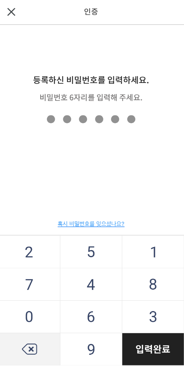 ▲ 앱을 사용하려면 이렇게 6자리 비밀번호를 입력해야 합니다. 본인인증 후 비밀번호를 설정해주세요. (저는 이미 비밀번호가 설정된 상태라 위와 같이 보이는 점 참고해 주세요.)
