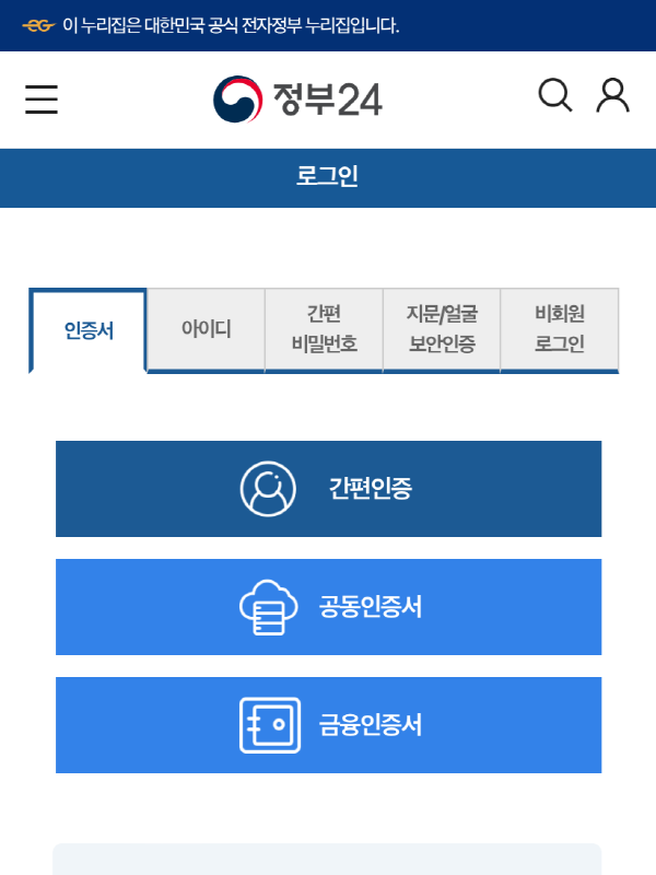 ▲ 마찬가지로 플레이스토어나 앱스토어에서 정부24 앱을 다운받아 주세요. 회원이 아니시라면 회원가입을, 회원이시라면 '로그인'을 진행해 주세요.