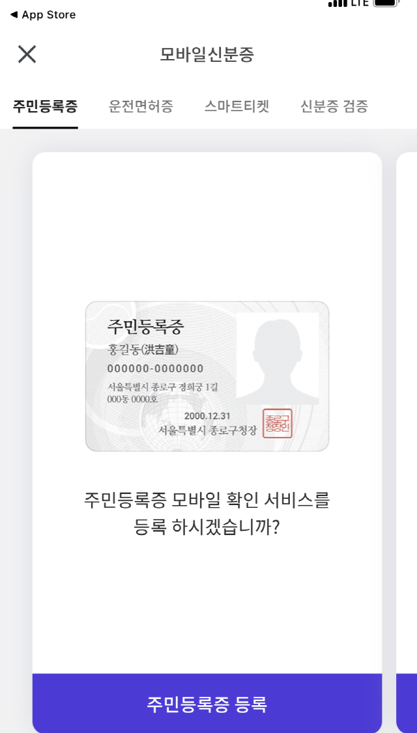 ▲ 화면에 보이는 것처럼 주민등록증, 운전면허증, 스마트티켓이 있는데 주민등록증 → 주민등록증 등록을 눌러주세요.