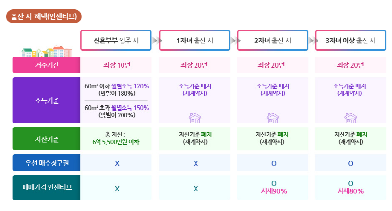 - 장기 거주 보장: 최대 20년까지 장기 거주 가능하며, 자녀 출산 시 소득 및 자산 기준에 상관없이 재계약이 가능합니다.