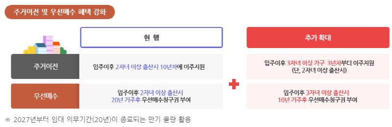 - 자녀 출산 인센티브: 자녀 수에 따라 더 넓은 평형으로 이주할 수 있는 기회가 제공됩니다.