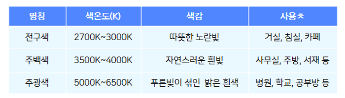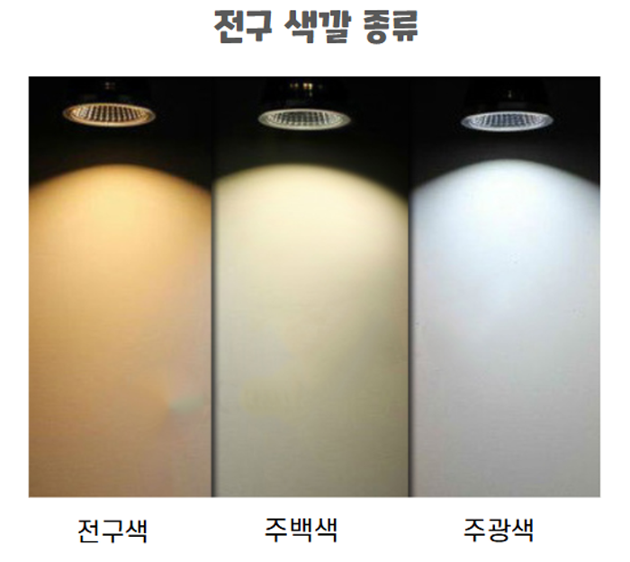 전구의 색온도(색깔)는 일반적으로 전구색, 주백색, 주광색으로 나뉘며, 각 색상은 조명의 분위기와 기능에 따라 다르게 사용됩니다.