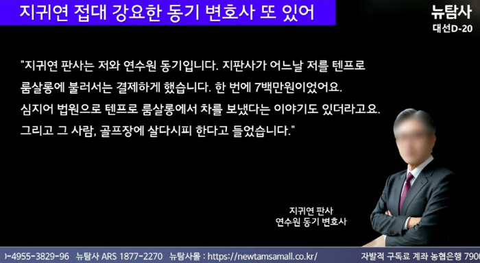 탐사전문 진보언론인 뉴탐사의 보도에 의하면 지귀연 판사가 연수원 동기이며 변호사인 지인을 룸살롱에 불러 700만원을 결제하게 했다고 합니다. 여기까지 보면 과연 이 사람이 현직 판사가 맞나 싶을 정도로 충격에 입이 다물어 지지 않는데요. 이렇게까지 여기저기 증언과 증거가 터져 나오고 있는 상황인데도 법원에서 입장 표명이 없다는게 그 동안 이 나라 사법기관이 얼마나 썩어 있었는지 새삼 깨닫게 됩니다.